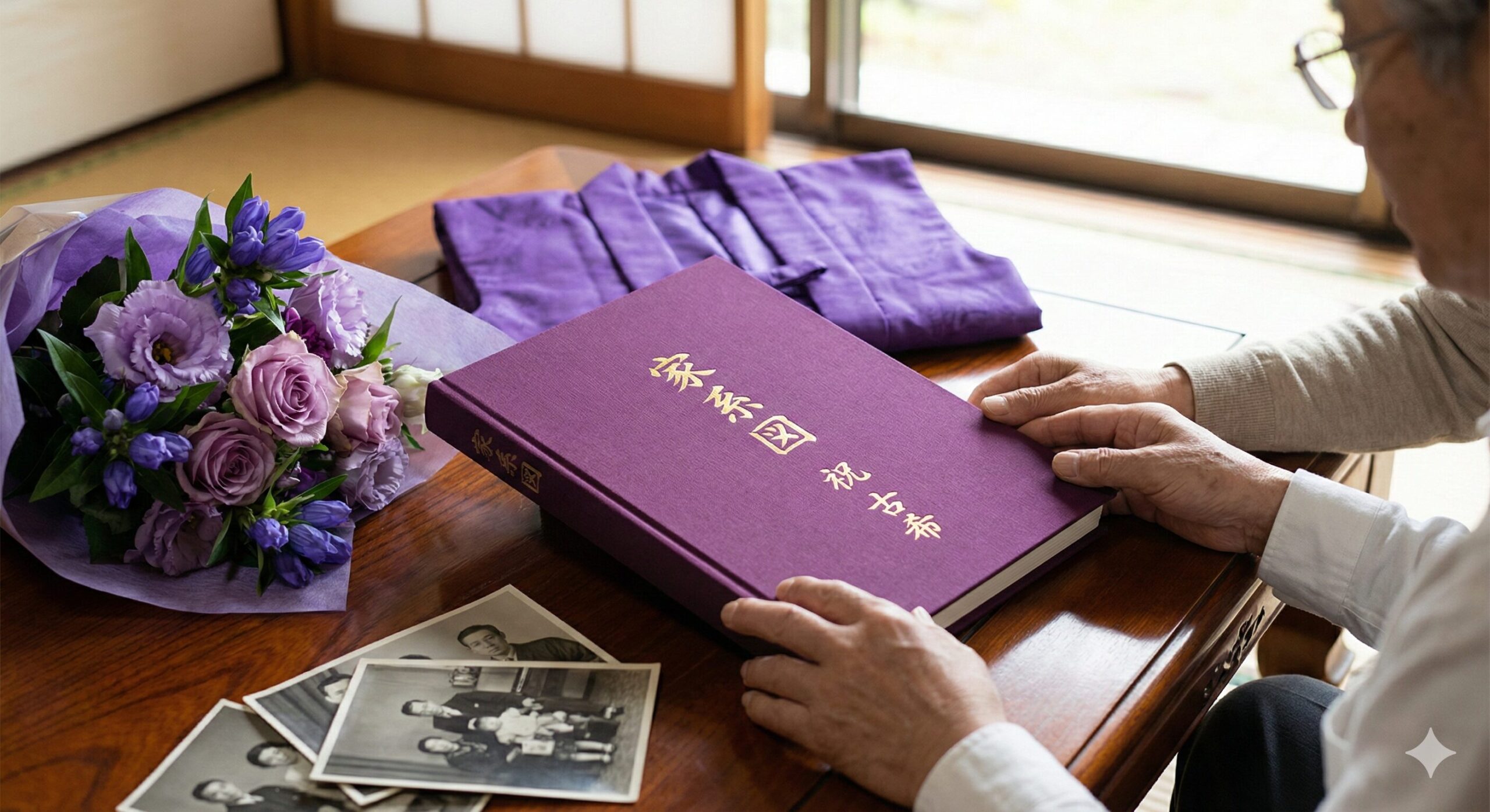 還暦が60歳という人生の区切りだとすれば、古希は70年という長い歳月を振り返り、次の世代へ想いを繋ぐタイミングと言えます。還暦祝いでは赤いちゃんちゃんこが象徴的ですが、古希では紫色のアイテムとともに、より深い意味を持つ贈り物が選ばれる傾向にあります。